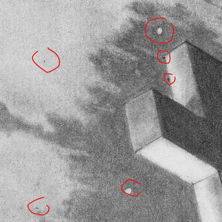 I will also "heal" (a Photoshop term) blemishes in the drawing that are an artifact of the drawing process. Scale or perspective lines, pencil errors or drops, etc. The final result for purchasers of my prints is a contrast of a rich black or color ink on the brilliant white background of fine art paper.